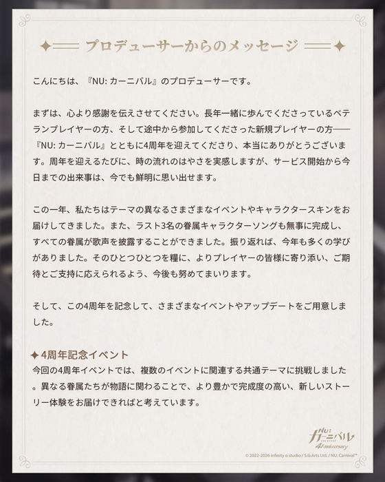 NU:カーニバルをプレイして頂いて本当にありがとうございます。4周年を迎える事が出来たのは応援してくださる皆様のおかげだと心から思っております!これからも皆様が楽しくプレイして頂ける様に微力ですが全力で頑張りますね!!これからもNU:カーニバルをよろしくお願いします!